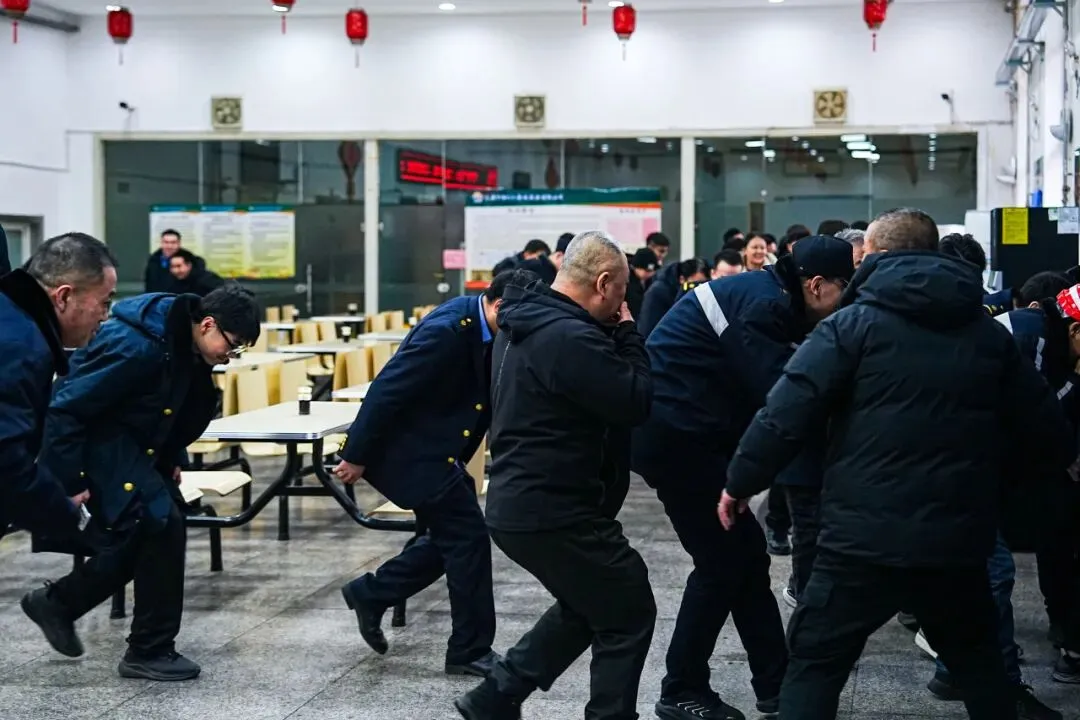 演练模拟食堂后厨因电气线路故障引发“火情”,火势快速蔓延、产生大量烟雾。段内保卫科消防队立即报警,启动应急预案,疏散引导组迅速组织职工用湿毛巾捂口鼻、低姿弯腰,沿预定路线快速撤离至安全集结点;灭火行动组就近取用灭火器、室内消火栓,开展初期火灾处置。