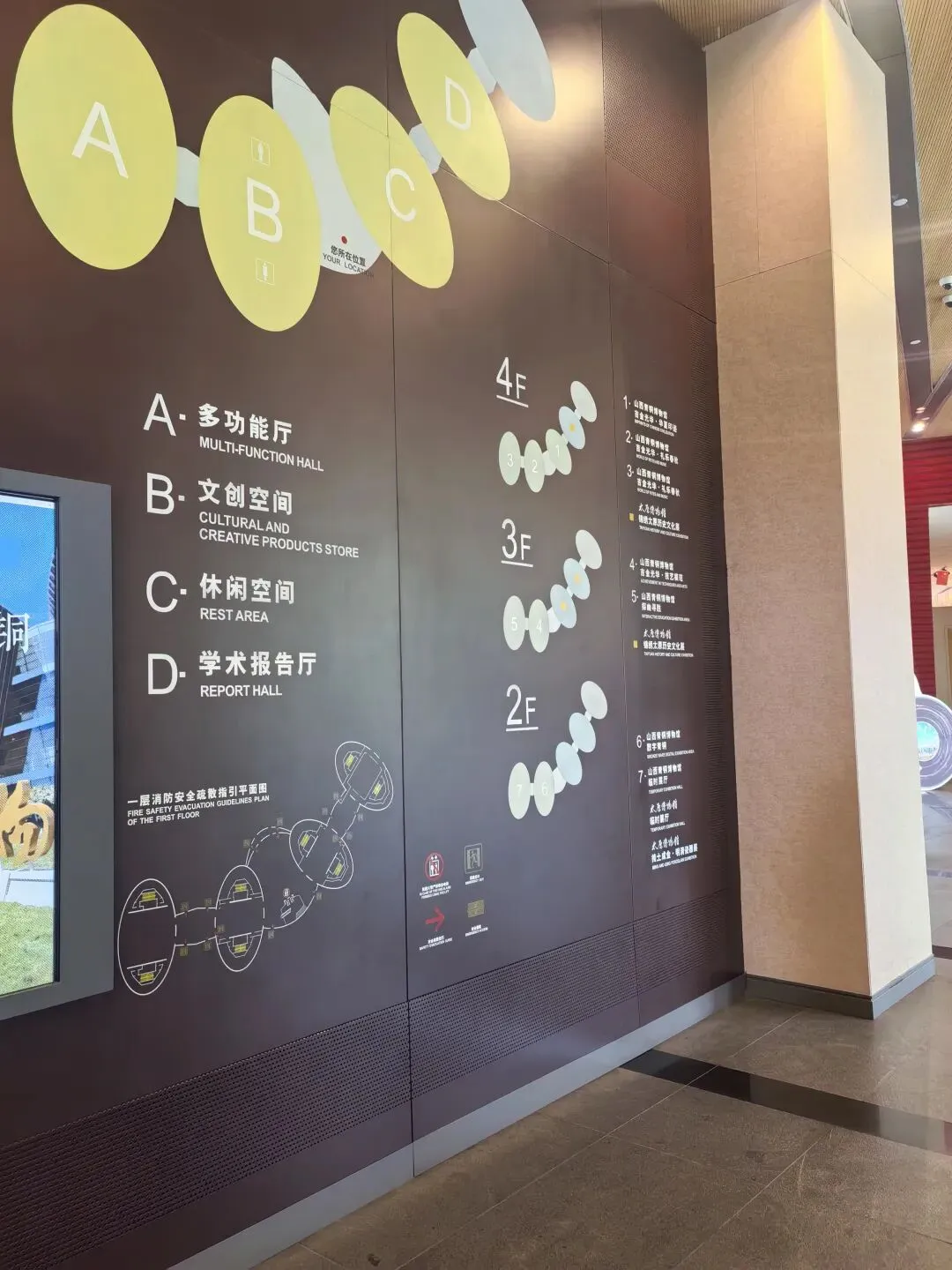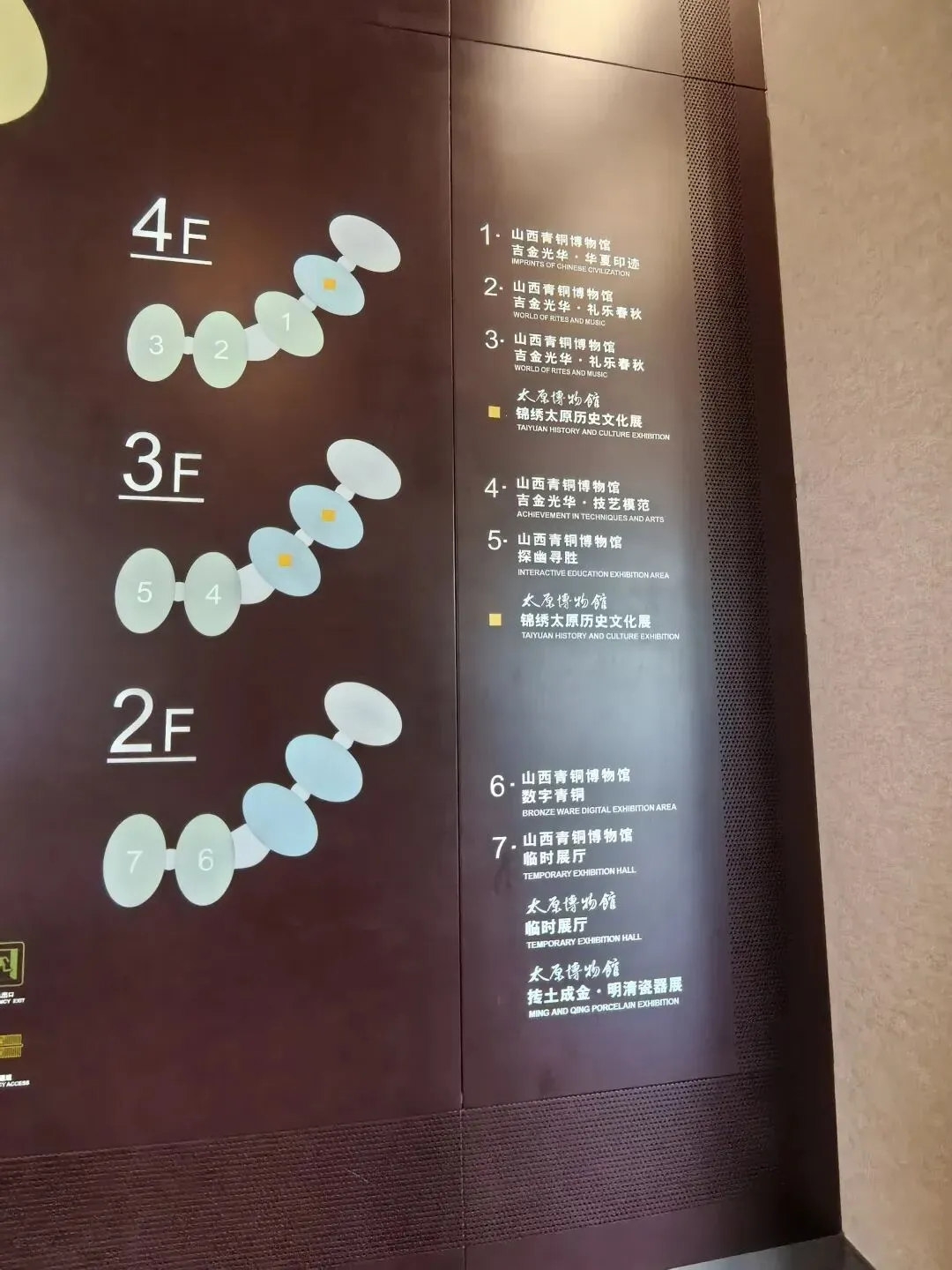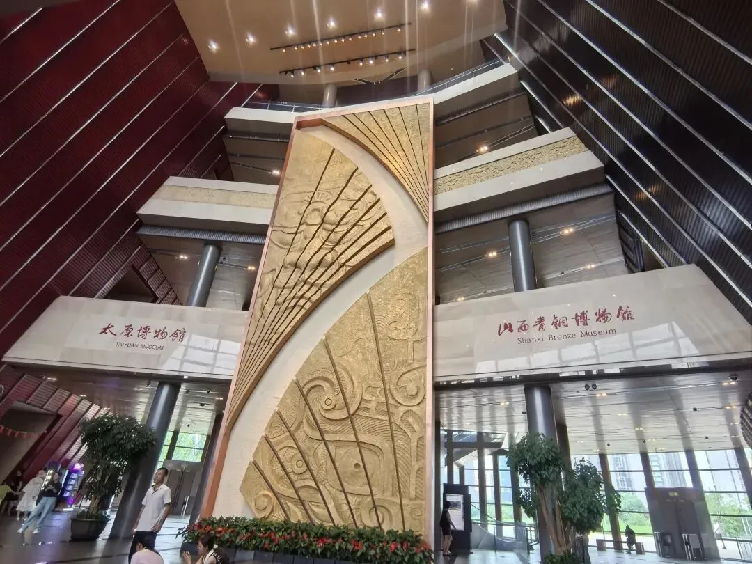 博物馆的序厅承担导览分流、主题导入作用,墙面配有太原“三山环抱、一水中分”的地貌示意与开篇文字;色调以青铜色、沉稳米色为主,结合灯光营造出古今对话的沉浸感;设有导览服务台,可获取资料、预约讲解。