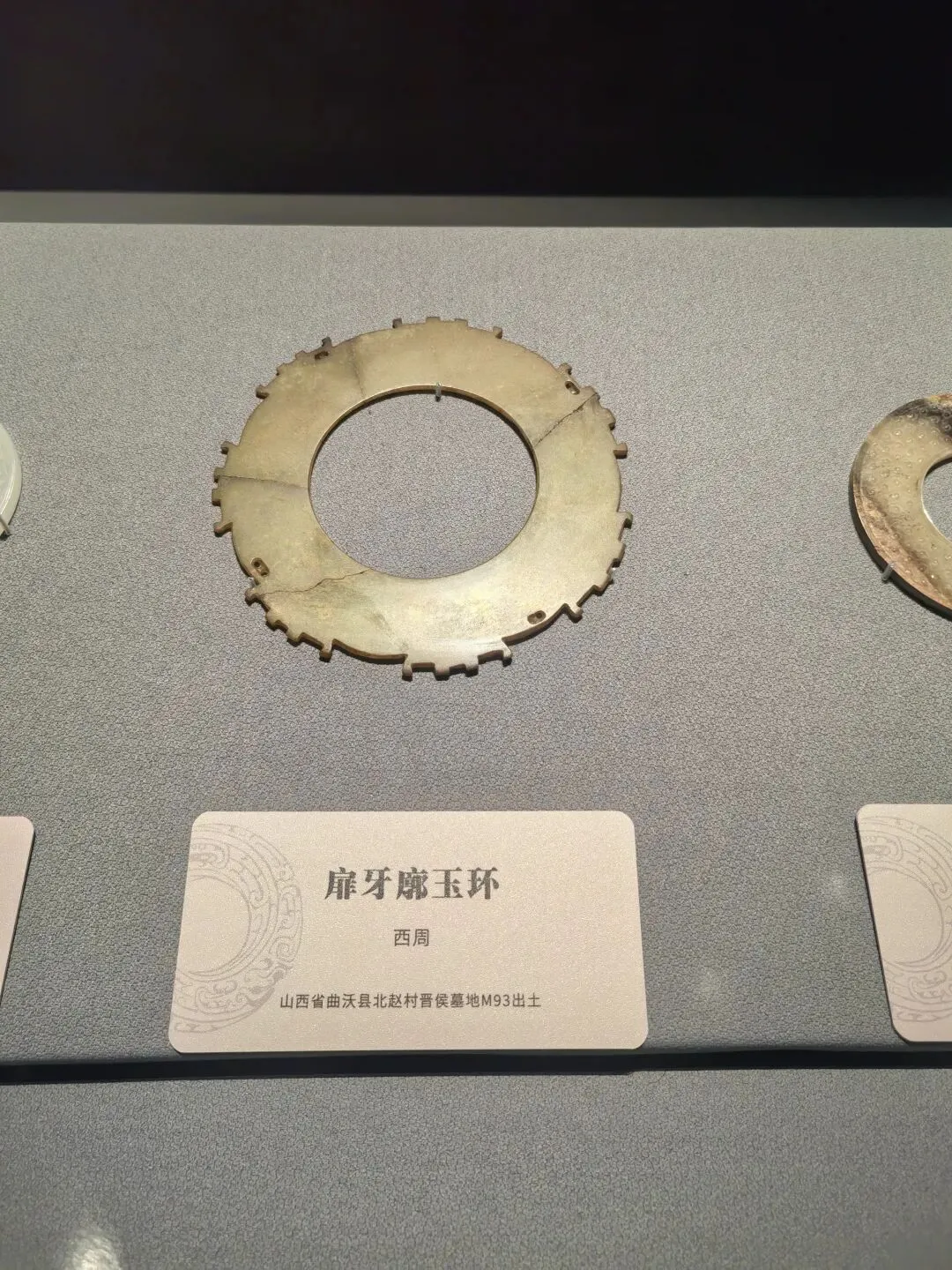 扉牙设计承袭自龙山文化的“玉牙璧”(玉璇玑),在西周时期演变为贵族玉器的标志性元素。这件玉环作为晋侯墓地的出土文物,它见证了晋国从西周早期到春秋初期的崛起,是研究晋文化的珍贵实物。