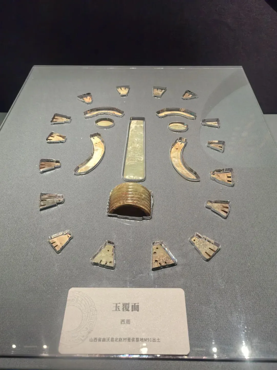 下面是一套玉覆面,又称玉面罩、缀玉幎(mì)目,是中国古代贵族丧葬时覆盖在死者面部的玉质殓具,属于葬玉的一种。目前考古发现的最早玉覆面可追溯至西周中期(约公元前10世纪),如山西曲沃晋侯墓地、河南三门峡虢国墓地等西周贵族墓中均有出土。