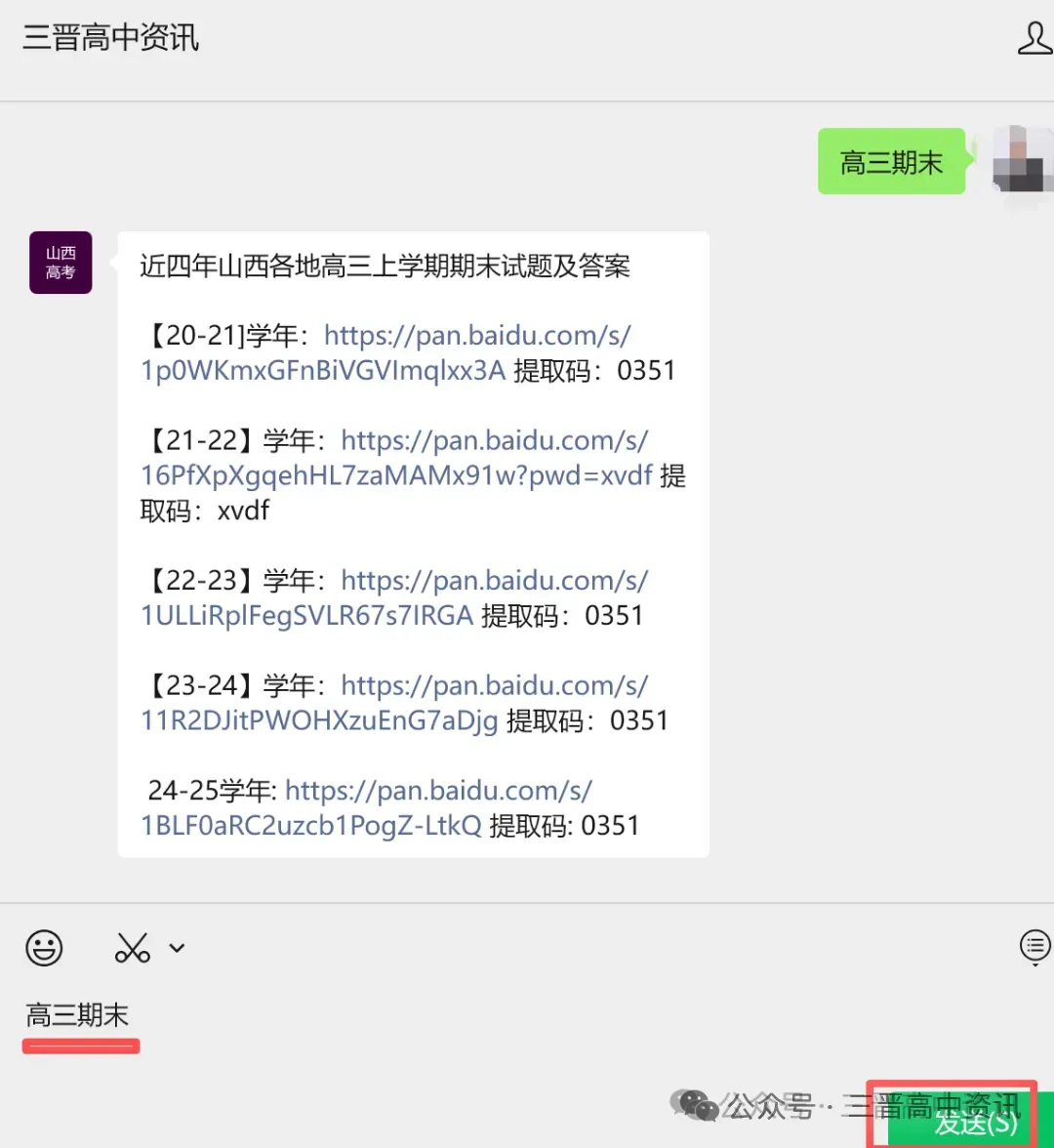 2、分别发消息“高一期末”“高二期末”“高三期末”即可获取下载电子版