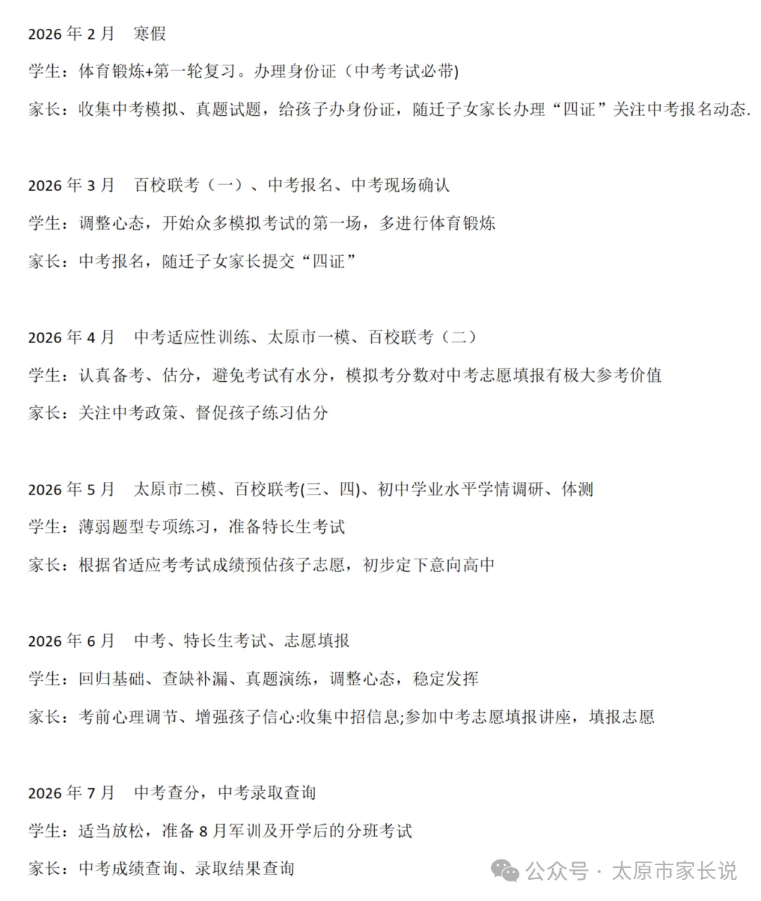 家长: 考前心理调节、增强孩子信心;收集中招信息;参加中考志愿填报讲座,填报志愿