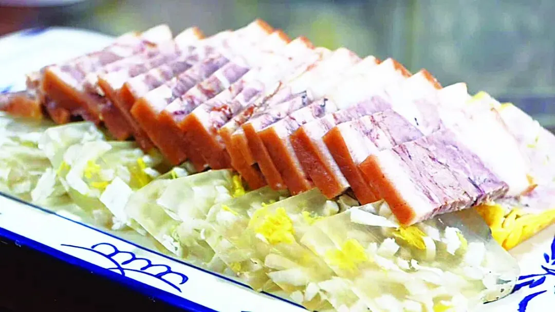 压猪头肉是年前腌腊重头戏,选整只猪头去毛洗净,抹盐加花椒、八角、桂皮腌渍数日,入锅慢卤至肉质酥烂,压制成型冷藏,切片紧实醇香。