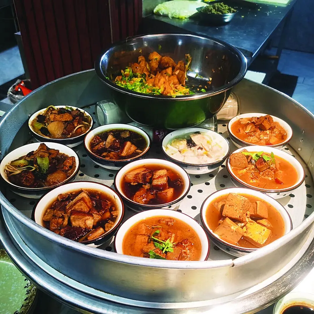 老太原春节宴席有“十碗九灌肠,剩下一碗炒灌肠”之说,物资匮乏时尤为凸显。猪血灌肠原料易得、成本低廉、饱腹感强,馏食或快炒皆宜,十碗菜九碗以其为主料配菜,撑场面且饱腹,压轴炒灌肠香辣提味,是晋地“物尽其用”智慧的体现,契合《山西通志·民俗志》“晋地宴客不贵珍馐重实惠”的记载。馂鸡块、压猪头肉、蒸烧肉、清蒸丸子多为家族私享珍味,油糕则宴席家宴皆可登席。