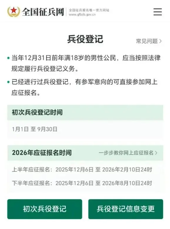 2026年12月31日前年满18周岁的男性公民(2008年1月1日至2008年12月31日之间出生),均应在网上进行初次兵役登记。