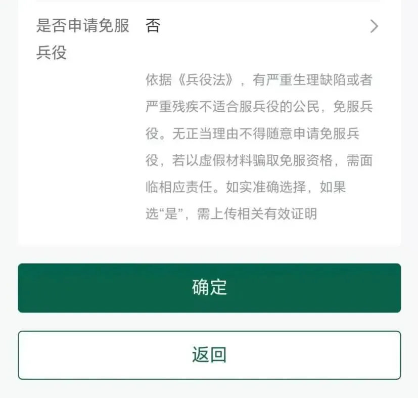最后就是2026年新增的一项内容——“是否申请免服兵役”,如果身体健康的填“否”,就是符合服兵役条件,当然兵役机关不会强制你去报名入伍。如果个人有服兵役意愿,需要在“义务兵征集”菜单里继续申请才能报名参军: