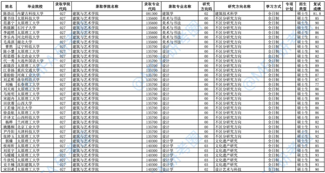 太原理工大学2026年建筑与艺术学院135600美术与书法、135700设计、140300设计学等专业推免保研录取名单。