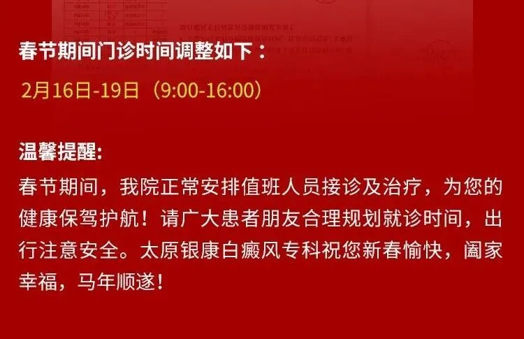 新春佳节,愿您暂放心中忧虑,享受与家人团聚的温暖时光,为新的一年积蓄力量。太原银康白癜风专科将继续以规范的诊疗、个性化的方案和温暖的陪伴,与您并肩前行,共同迎接健康、自信的明天。