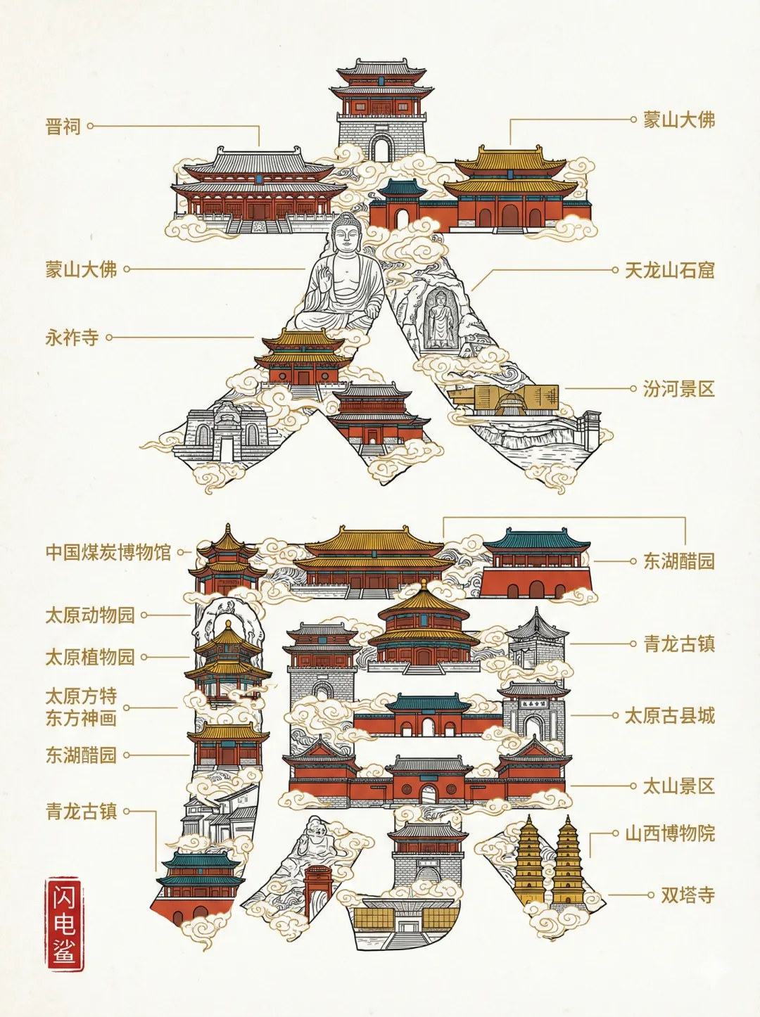 (图中景点:晋祠、蒙山大佛、永祚寺、双塔寺、天龙山石窟、汾河景区、中国煤炭博物馆、东湖醋园、青龙古镇、太原动物园、太原植物园、山西博物院、东湖、太行山)