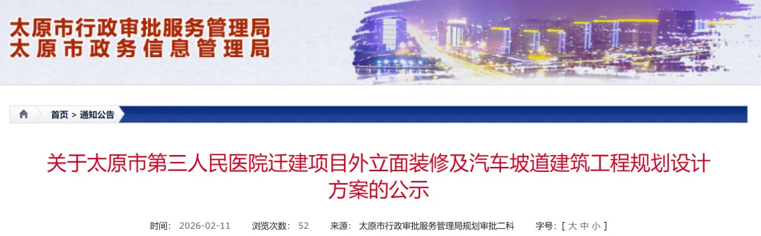 太原市第三人民医院迁建项目外立面装修及汽车坡道由太原市第三人民医院建设开发,由太原市建筑设计研究院设计。