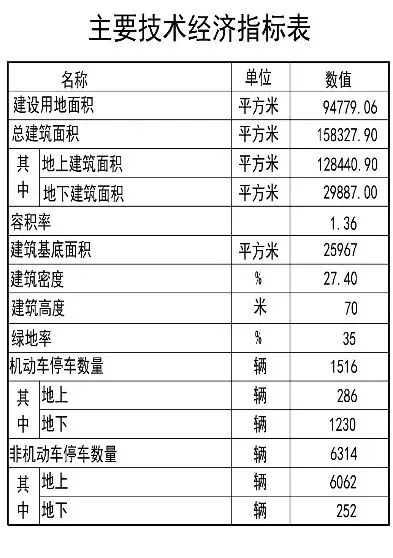 项目总用地面积94779.06㎡,总建筑面积158327.9㎡,其余详细经济技术指标见下图。