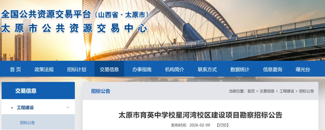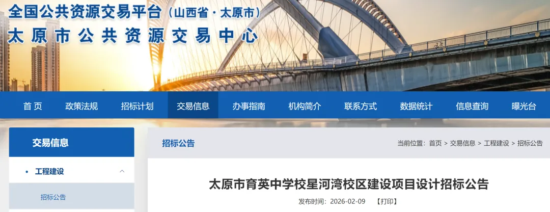 2月9日,太原市公共资源交易中心发布了太原市育英中学校星河湾校区建设项目勘察与设计招标公告。公告显示:本招标项目太原市育英中学校星河湾校区建设项目已由太原市行政审批服务管理局批准,建设资金来自申请市财政资金。招标人为太原市城市建设管理中心,本项目已具备招标条件,现进行公开招标。本项目位于太原市星河湾南街以北,平阳南路以西,星河街以南,滨河东路以东。总建筑面积42094平方米(其中:地上建筑面积34094平方米,地下建筑面积8000平方米);项目主要建设教学综合楼、学生公寓、食堂、体育馆、室外运动场、地下车库、人防工程,以及其他配套设施和公用工程。总投资额约28861.32万元。其中设计招标范围为本项目的方案设计、初步设计、施工图设计及相关服务。勘察招标范围为本项目的勘察及相关服务。太原市育英中学校创建于1948年4月,前身是“晋察冀野战军干部子弟学校”,1949 年 5 月迁到太原市,是一所具有光荣革命传统的太原市教育局直属完全中学。学校是“山西省示范高中”、“全国现代教育技术实验学校”、“全国高效课堂建设示范学校”、“全国国防教育特色学校”、“全国学科竞赛500强高中”、“山西省德育示范学校”、“山西省基础教育课程改革先进学校”、“太原市普通高中新课程实施实验学校”。