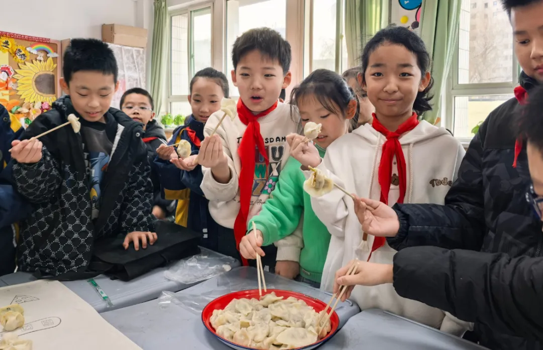 中年级围绕“晋味饺与吉祥馄饨——巧手包制,品味团圆”展开,通过视频讲解山西“冬至吃饺”“元宝招财”的民俗寓意,家长示范擀皮、包馅技法,学生们在指导下控制馅料用量,尝试用面团捏“马耳朵” 装饰,在实践中掌握基础技法、体会团圆文化。