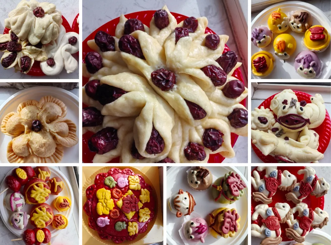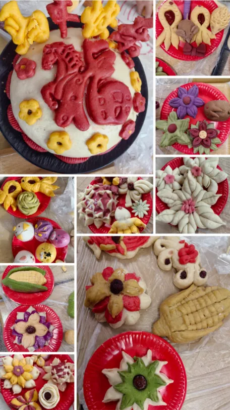 高年级聚焦“枣花馍马到成功——精雕细琢,传递祝福”,老师解读枣花馍的春节团圆寓意与“马到成功”的吉祥内涵,家长与孩子协作揉面、嵌枣、捏塑,精心制作骏马造型花馍,完成后整理蒸屉等待蒸制,在精雕细琢中深化协作情感、传承传统美食文化。活动中师生家长共同探究花馍非遗价值与节庆寓意,各小组构思“骏马踏春”等主题,运用揉、剪、嵌等技法搭配红枣、豆类装饰完成特色作品,课后学生还将撰写传承日记,寄托新年愿景、强化非遗传承责任感。
