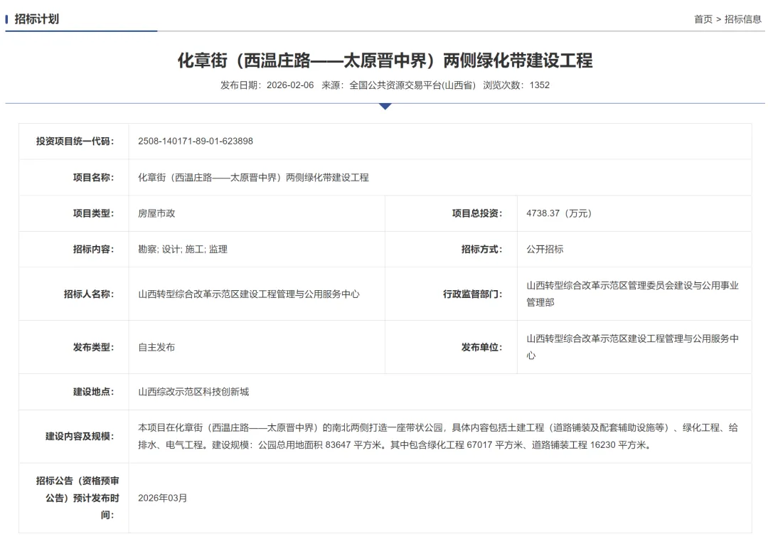 化章街(西温庄路——太原晋中界)两侧绿化带建设工程项目总投资4738.37万元。