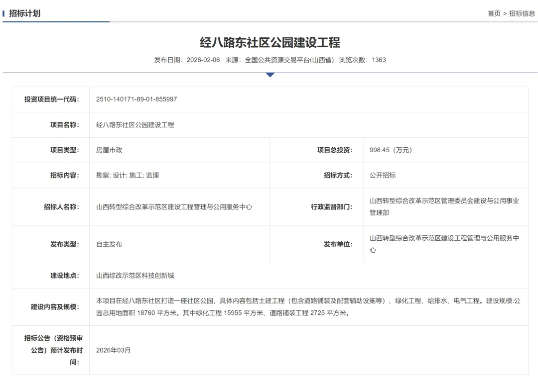 本项目在经八路东社区打造一座社区公园,具体内容包括土建工程(包含道路铺装及配套辅助设施等)、绿化工程、给排水、电气工程。建设规模:公园总用地面积 18760 平方米。其中绿化工程 15955 平方米、道路铺装工程 2725 平方米。