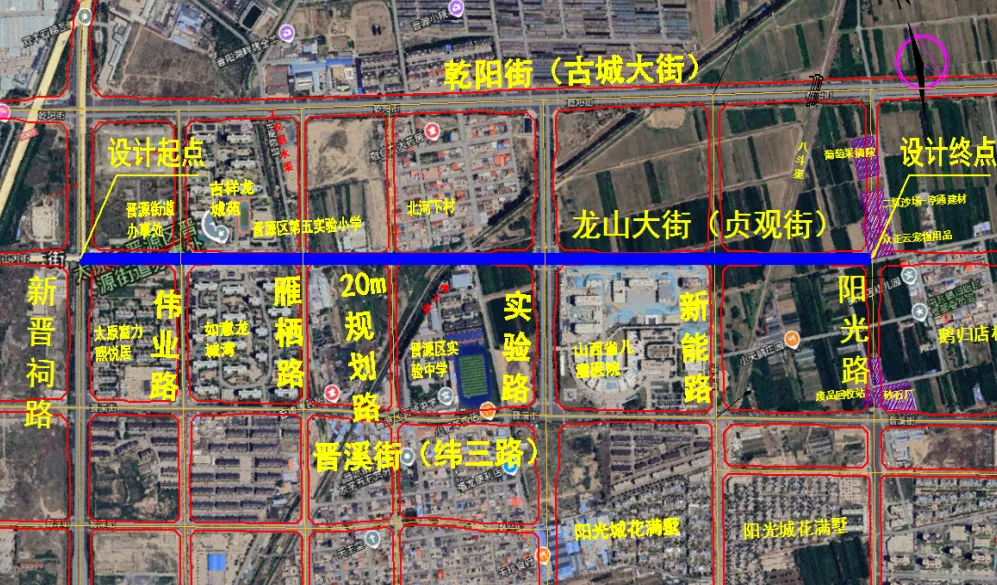 晋阳大道至新晋祠路段:结合现状树木,横断面布置为中间21米车行道,两侧各2米绿化带,2.5米人行道。