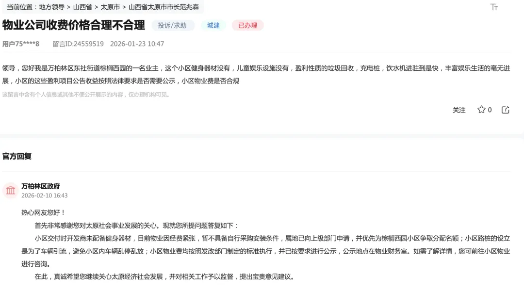 领导,您好我是万柏林区东社街道棕榈西园的一名业主,这个小区健身器材没有,儿童娱乐设施没有,盈利性质的垃圾回收,充电桩,饮水机进驻到是快,丰富娱乐生活的毫无进展,小区的这些盈利项目公告收益按照法律要求是否需要公示,小区物业费是否合规?小区交付时开发商未配备健身器材,目前物业因经费紧张,暂不具备自行采购安装条件,属地已向上级部门申请,并优先为棕榈西园小区争取分配名额;小区路桩的设立是为了车辆引流,避免小区内车辆乱停乱放;小区物业费均按照发改部门制定的标准执行,并已按要求进行公示,公示地点在物业财务室。如需了解详情,您可前往小区物业进行咨询。棕榈西园由山西华鑫房地产开发有限公司(联合中铝集团投资)开发,项目于2019年11月开盘,2022年10月整体交房。交房后,有业主反映墙面不平整、门窗安装偏差、部分区域隔音效果一般等毛坯交付常见问题,多通过物业与开发商协商整改解决。项目位于山西省太原市万柏林区兴华西街与西中环交汇处西北角(石膏厂街16号),地处兴华商圈,紧邻西中环快速路,交通便捷。物业公司为山西裕达物业管理有限公司,物业费2元/㎡・月,负责小区安保、清洁、绿化养护、设施维修等;从网上的信息看,业主反馈中有少量关于报修响应速度、小区停车管理的零星吐槽,但无大规模维权事件。
