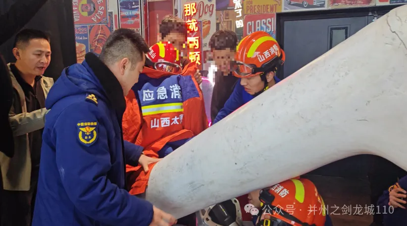 王祥迅速拨打119报警电话,并准确调度特勤大队二站派出抢险车辆及人员赶赴现场。挂断电话后,他始终守护在孩子身旁,仔细察看孩子膝盖被卡的具体位置与恐龙骨架的结构。
