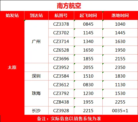 太原 → 广州(CZ3378)