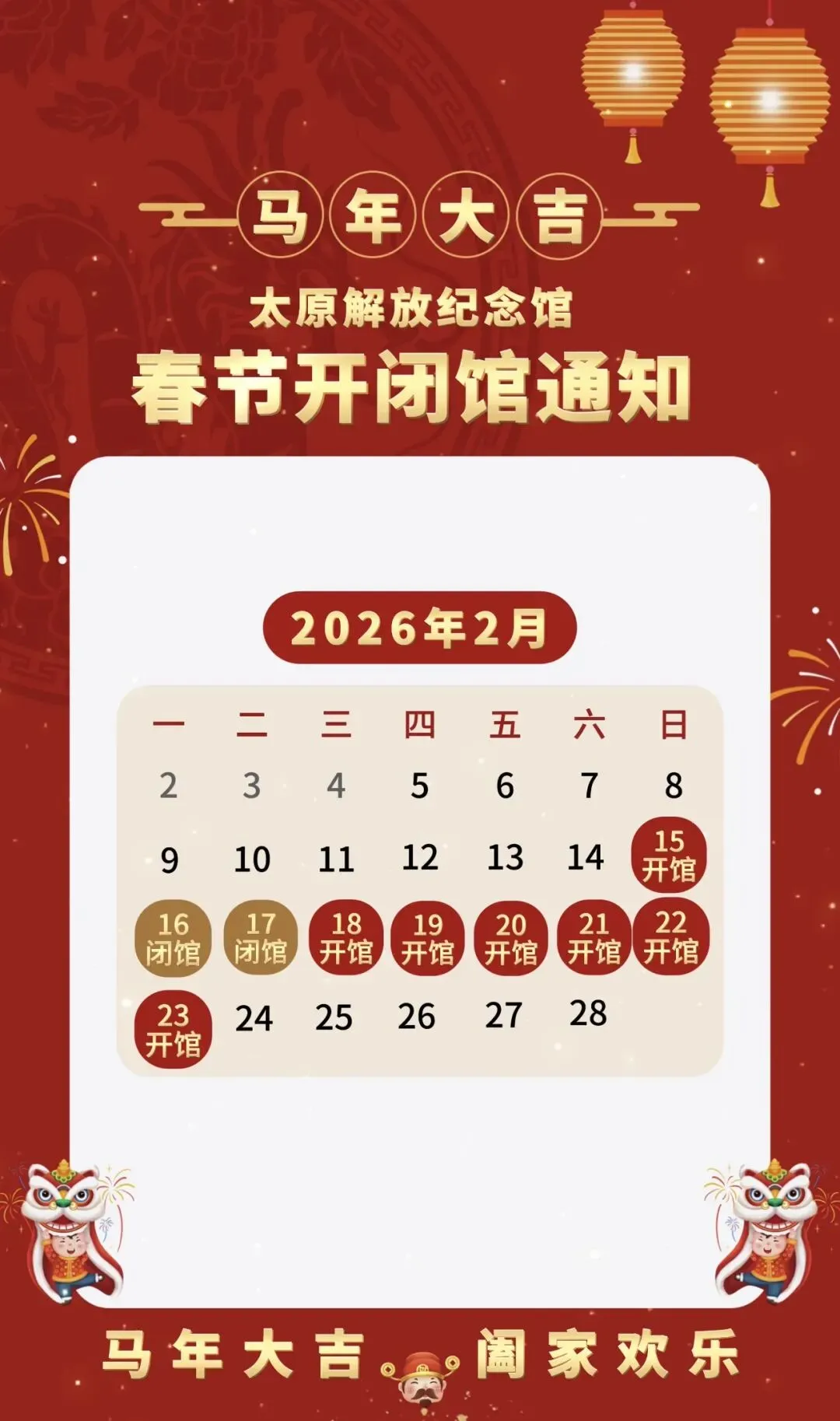 律回春晖渐,万象始更新。值此丙午马年春节来临之际,太原解放纪念馆谨向您致以最诚挚的新春祝福!为让广大游客在阖家团圆的节日氛围中,既能感受新春暖意,又能浸润红色文化,我们精心调整了开放时间,陪伴大家度过一个充实而有意义的春节。现将具体开放事宜公告如下:
