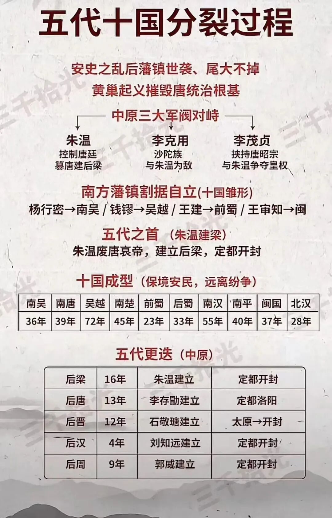 五代十国(907年—979年)是中国历史上一个动荡不安的大分裂时期,除了中原地区的梁、唐、晋、汉、周五个朝代外,中原地区之外存在过前蜀、后蜀、南吴、南唐、吴越、闽国、南楚、南汉、南平、北汉等十个割据政权。