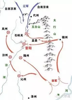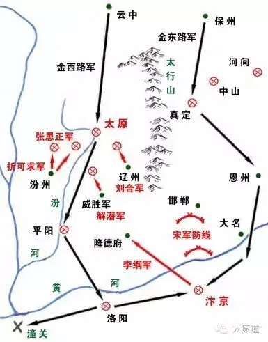 太原重建一百四十多年后,金太宗以北宋接纳辽军降将张觉为借口,挥师伐宋。金军的计划是兵分两路,西路军以宗翰也就是《说岳》中的粘罕为主帅,率军六万,从西京大同出发,攻占太原,东路军以另一员竭力主张攻宋的大将宗望为主帅,率军六万,自平州入燕山,直取真定,然后两路大军会师于开封城下,一举灭亡在联合攻辽的战争中被金军鄙薄蔑视的弱宋。