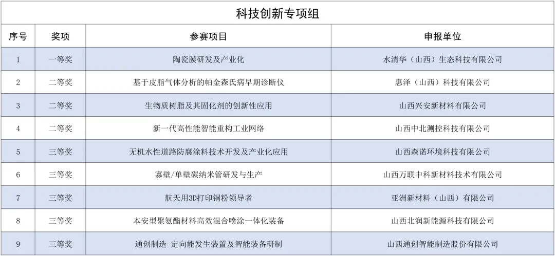 根据第十届“创青春”太原青年创新创业大赛暨山西中部城市群青年创新创业大赛评审办法,经初赛、复赛和决赛三个环节,共5个项目荣获一等奖,14个项目荣获二等奖,28个项目荣获三等奖,除一二三等奖以外所有入围决赛的项目均获得优秀奖,现将获奖名单进行公告。