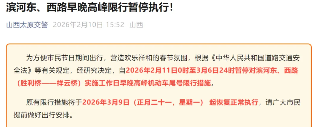 为缓解春节期间市区停车难压力,方便广大市民和游客出行,让大家度过一个欢乐、祥和的新春佳节,根据市委、市政府安排,现将2026年春节期间免费开放路内公共停车泊位及部分专用停车场有关事宜通告如下: