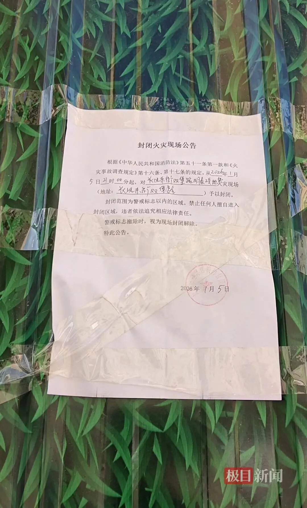 事发地贴有火灾现场封闭的公告(记者实拍)