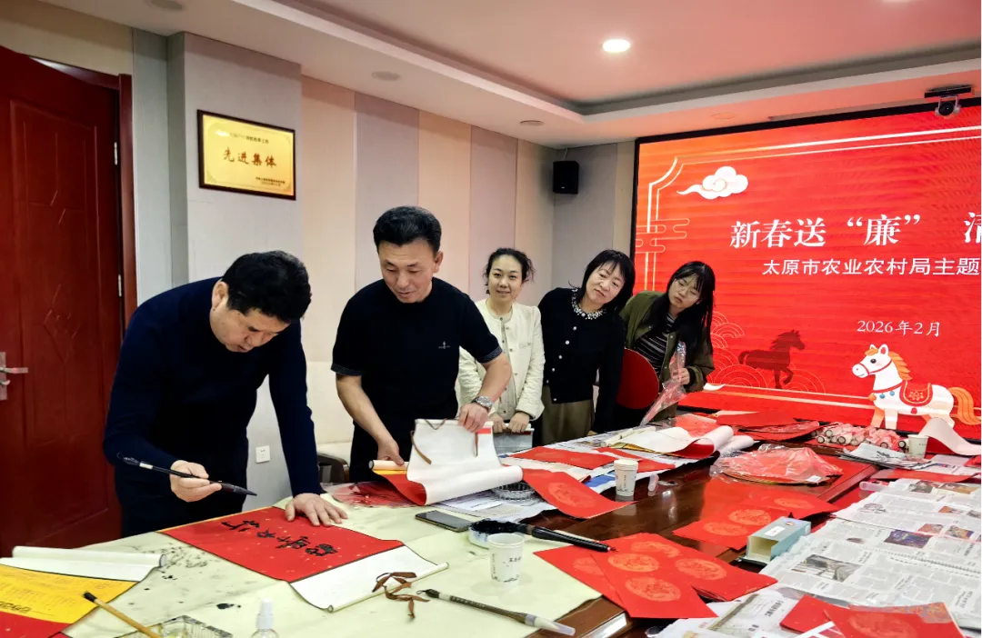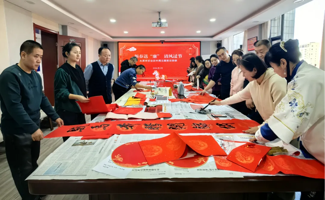 新春将至,年味渐浓。2月11日下午,太原市农业农村局举办“新春送‘廉’ 清风过节”主题党日活动,以写春联为媒,将廉政教育与传统年俗有机融合,厚植廉洁文化根基,营造欢乐祥和、风清气正、文明节俭的节日氛围。