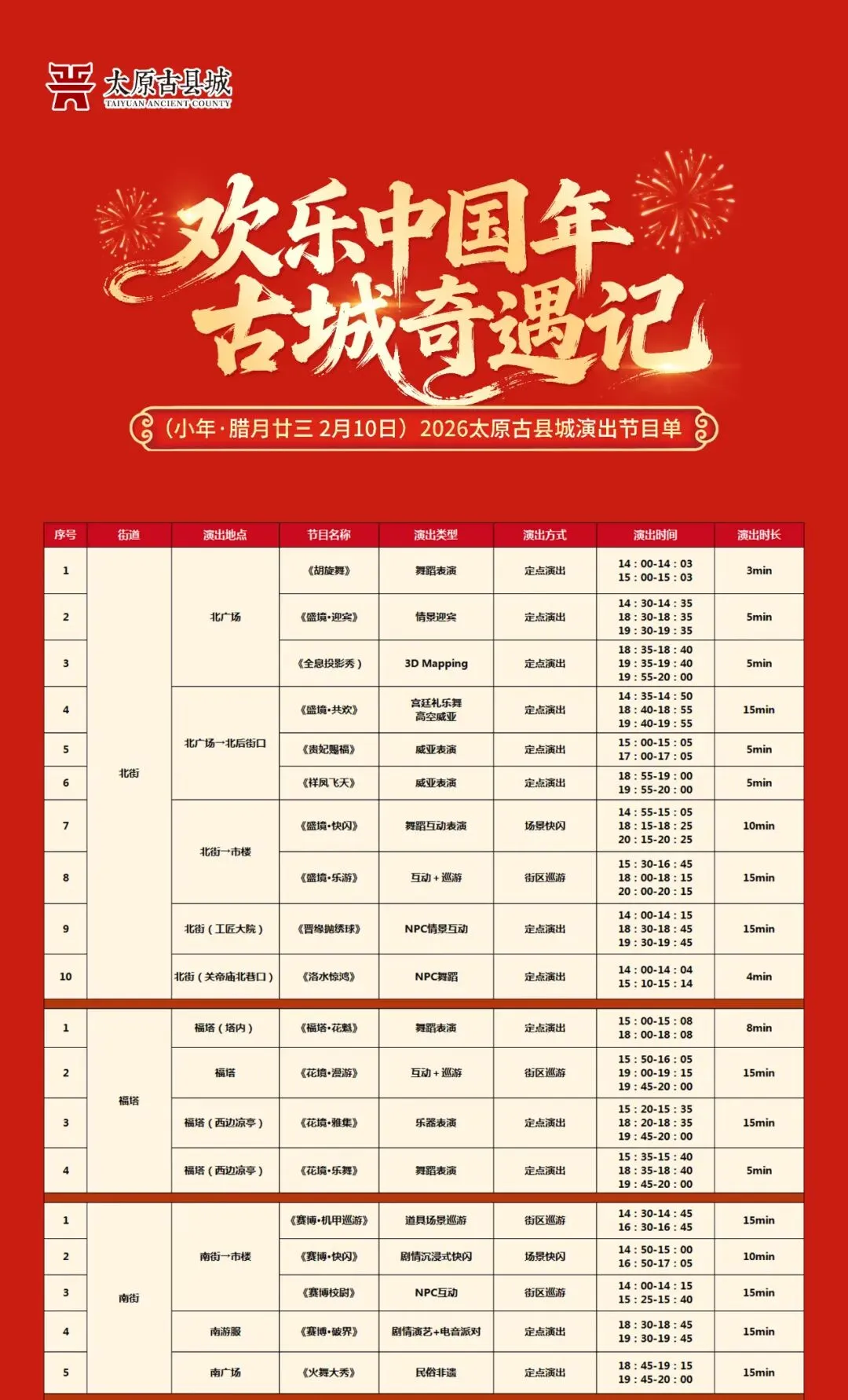 从白日巡游到夜场光影,从古风雅韵到赛博狂欢,太原古县城以全天不间断演艺、全场景沉浸式体验,让晋韵文化与现代科技碰撞、传统年味与潮趣创意相融。小年启灯仅是开篇,正月初一至十六,七大场景好戏连台,灯彩、民俗、互动三重惊喜持续加码,诚邀八方游客赴一场有底蕴、有乐趣、有温度、有共鸣的古城新春奇遇,在晋阳故里共度欢乐中国年。