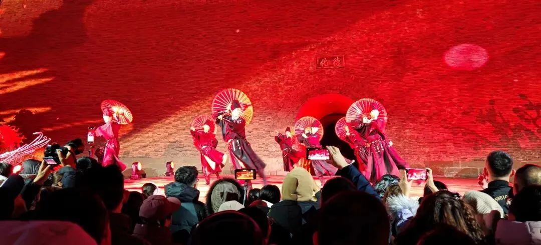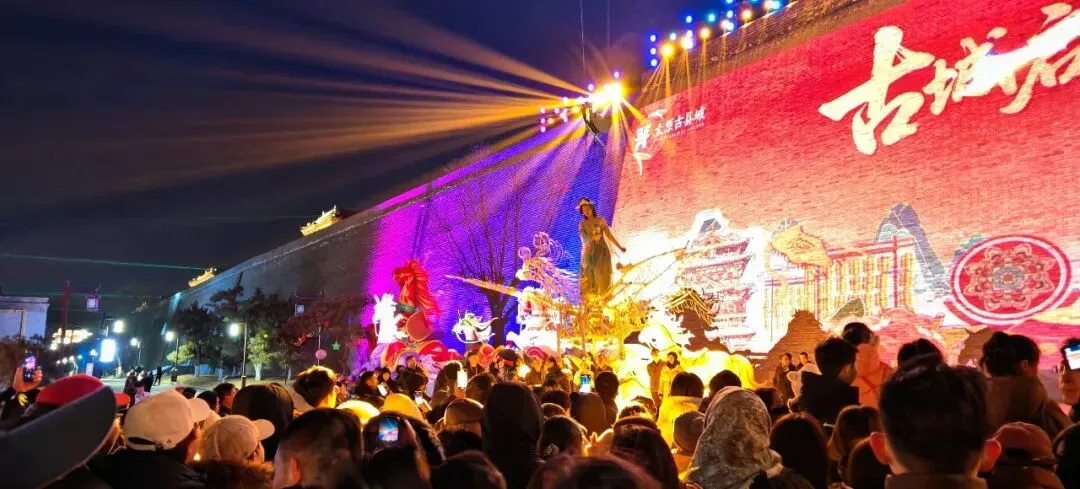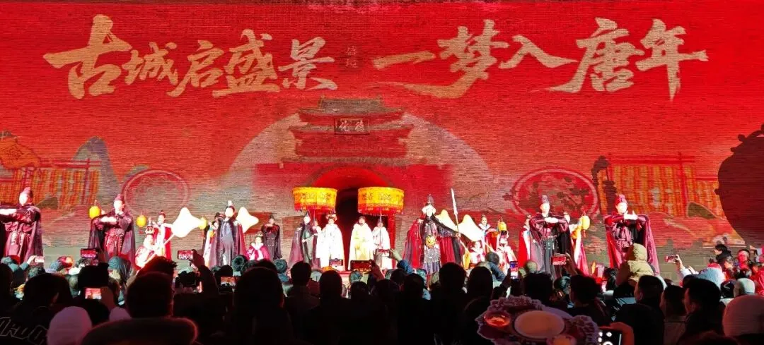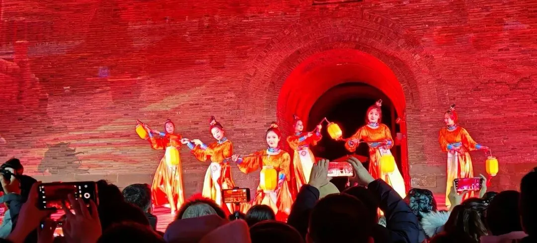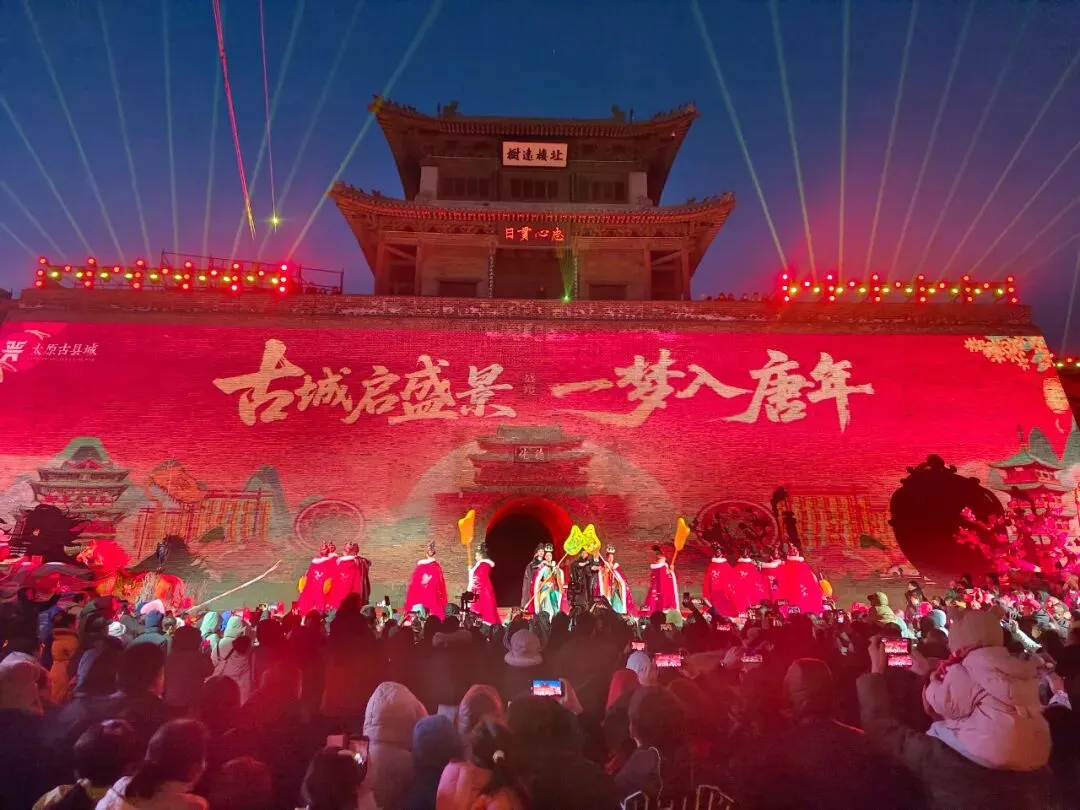 腊月二十三晚18时35分,北门城楼处,一场震撼人心的点灯仪式正式拉开帷幕。此时盛唐礼乐缓缓奏响,编钟古乐与鼓点交叠,浑厚音律穿透夜空。城楼前的唐风舞者身着霓裳,踏着乐声翩跹起舞,衣袂翻飞间,手中宫灯次第点亮。随着礼乐推向高潮,李世民扮相的演员率众臣缓缓而来,行至城楼之下,以古礼祈愿,抬手示意间,尽显盛唐气韵。城楼青砖墙面化作光影画布,晋阳古城的千年兴衰、李世民归晋的浩荡场景、龙兴之地的繁华盛景在墙面流转,虚实交融间,仿佛时空被瞬间折叠。