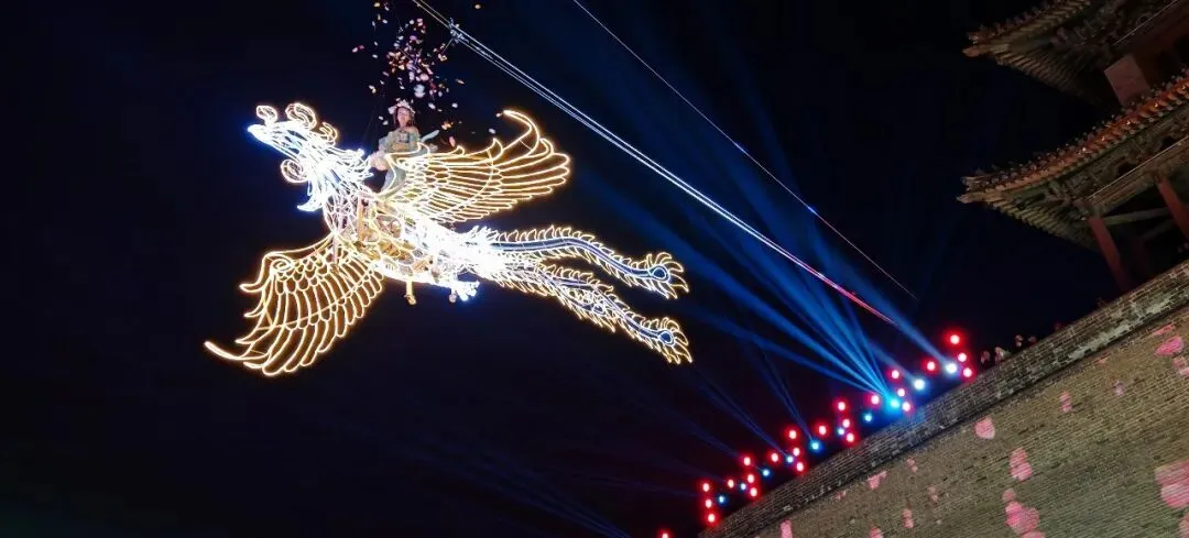当投影中花瓣飘落,仙女威亚飞天表演惊艳登场。身着唐制仙裙的舞者自城门处乘凤飞起,衣袂如流云舒展,宛若星河坠落人间。她在夜空之中翩然飞舞,撒下花瓣。现场气氛达到高潮,随着点灯仪式完美结束,北门城楼通体璀璨,与全息投影中的龙纹光影、漫天巨型灯彩连成一片,整座城楼化作盛唐天宫,光芒映照下,盛唐晋阳的盛景跃然眼前。