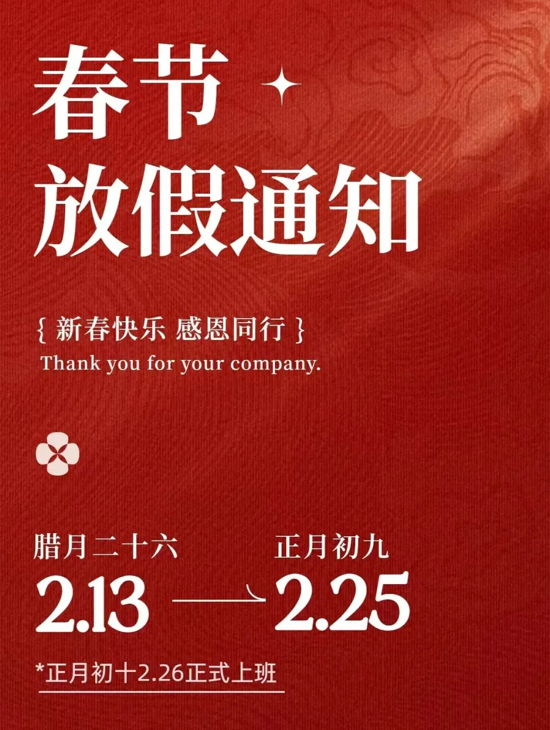 为让团队与家人共度团圆祥和的春节,同时以更饱满的状态迎接新一年的服务使命,结合行业实际情况,现将放假安排正式告知: