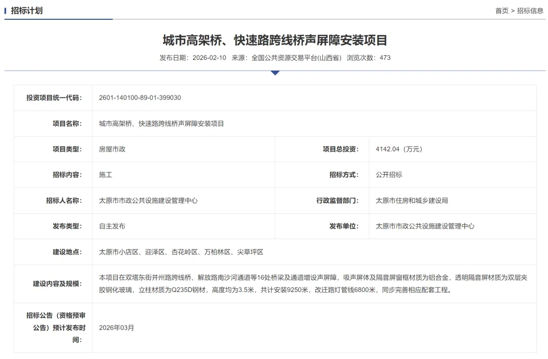城市高架桥、快速路跨线桥声屏障安装项目总投资4142.04万元,招标内容为施工。项目建设地点位于太原市小店区、迎泽区、杏花岭区、万柏林区、尖草坪区。