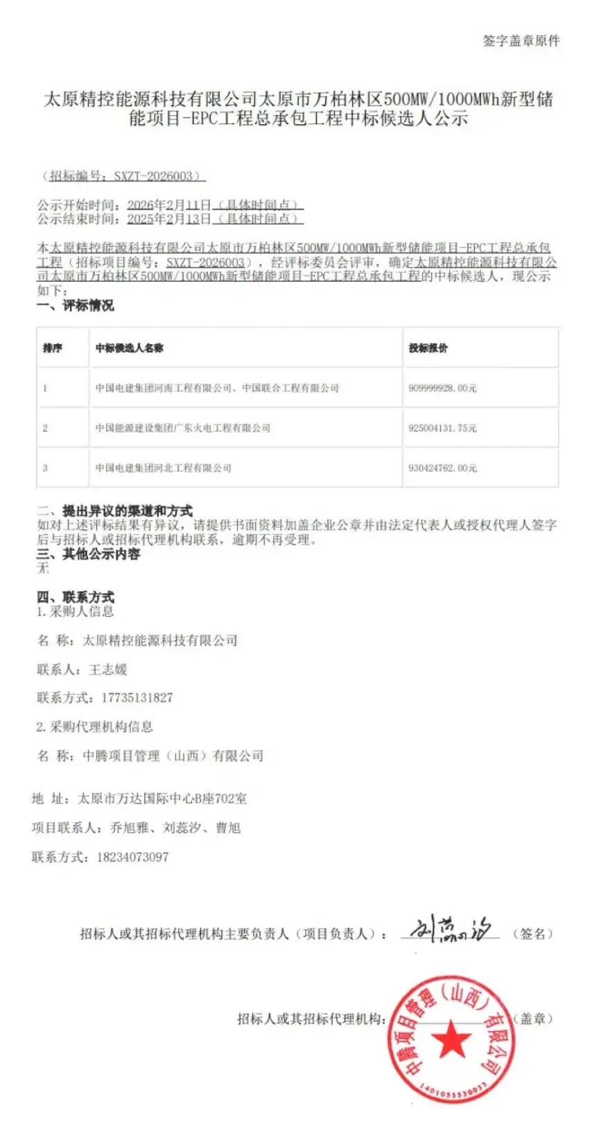 储能与电力市场获悉,2月11日,太原精控能源科技有限公司太原市万柏林区500MW/1000MWh新型储能项目-EPC工程总承包工程中标候选人公示。