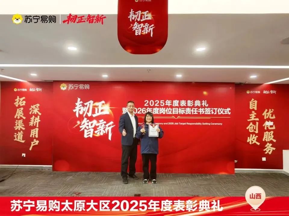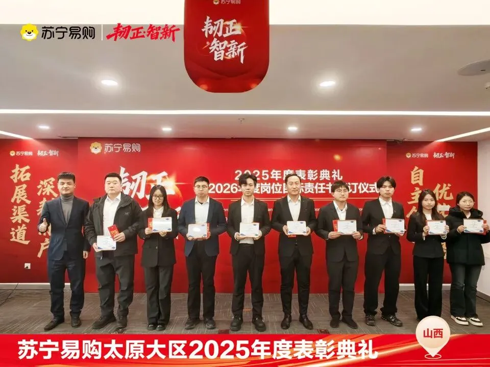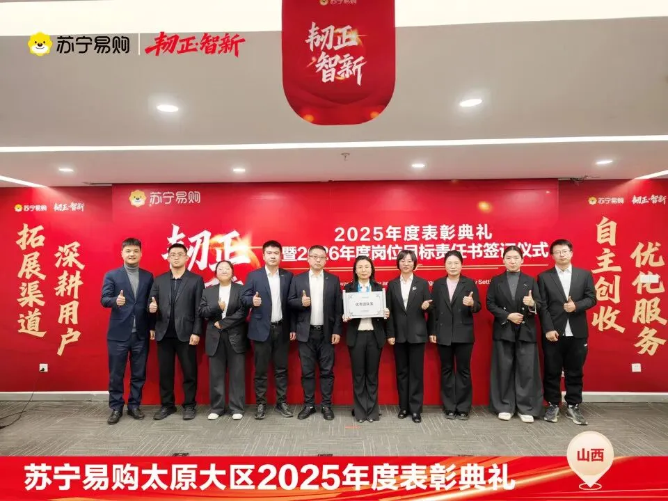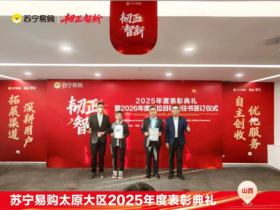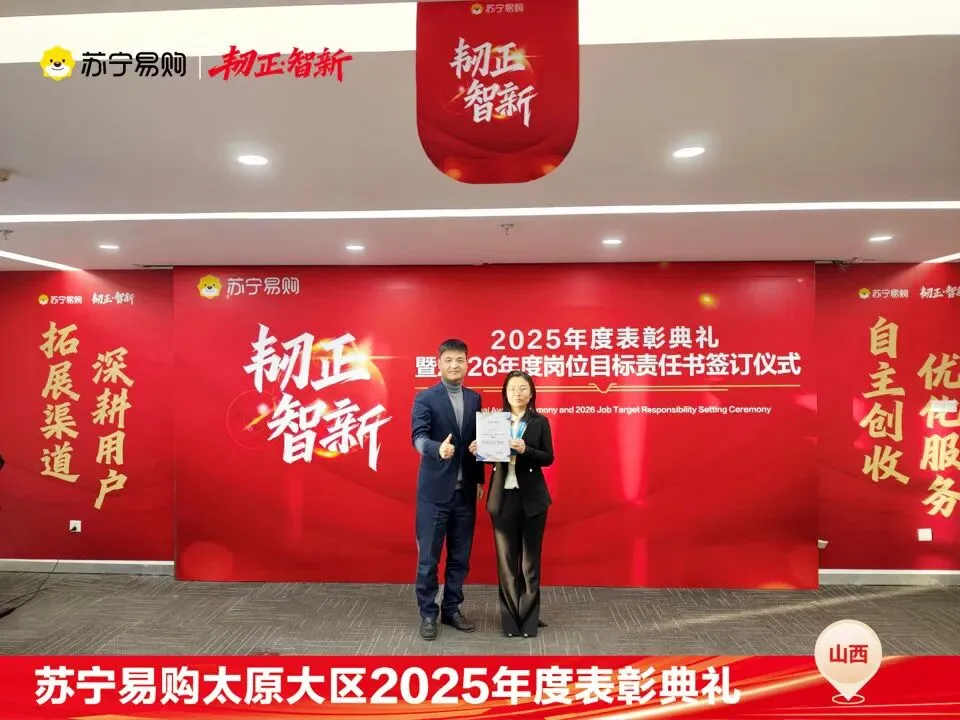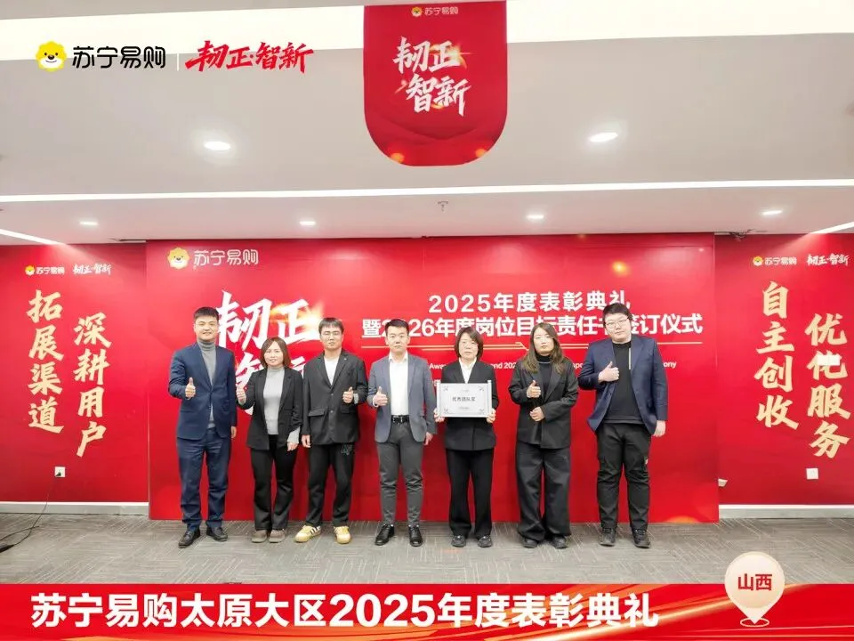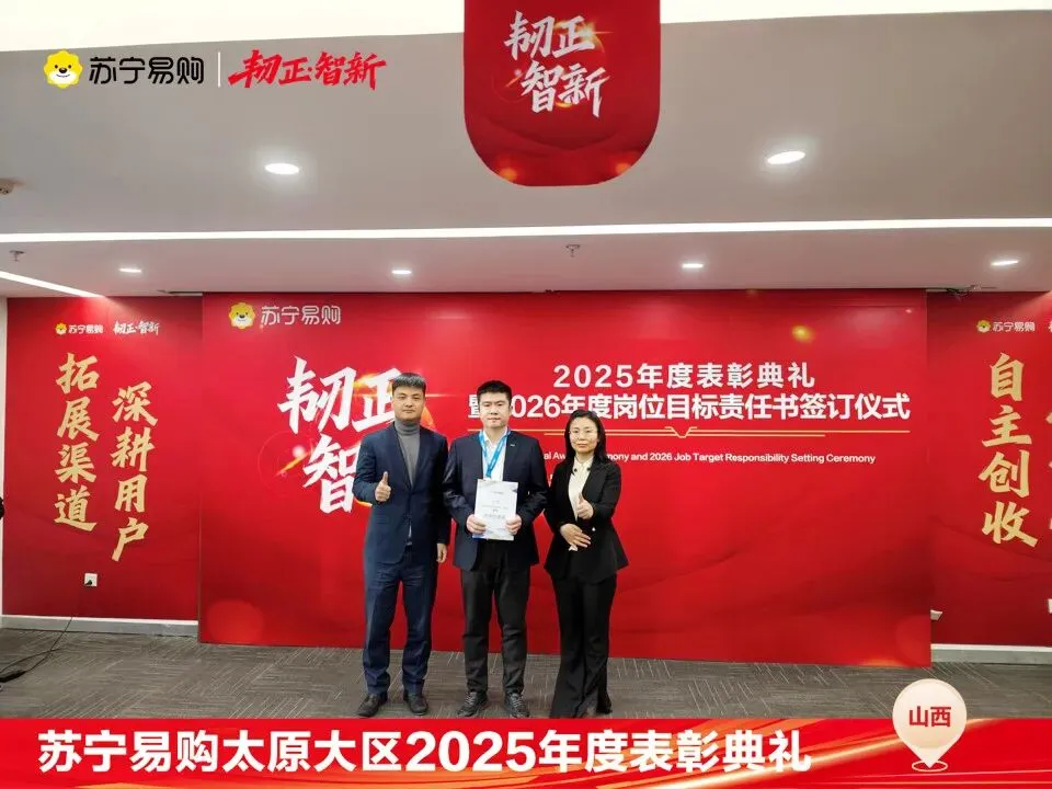 表彰不仅是一种荣誉,对获奖个人与团队在过去一年的业绩、付出的肯定和认可,更是对新的一年业绩、担当上的更高的期望,这也是一份责任和使命。再次向所有获奖人员和团队表示祝贺。同时2026年的战役已打响,让我们一起攻坚克难,再创属于太原大区、属于每一位山西苏宁人的辉煌!