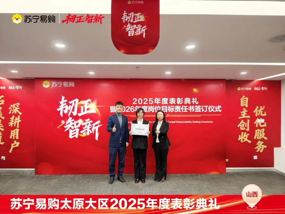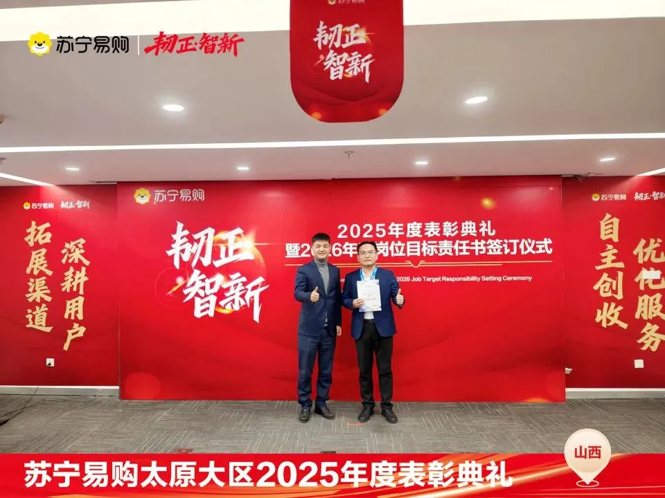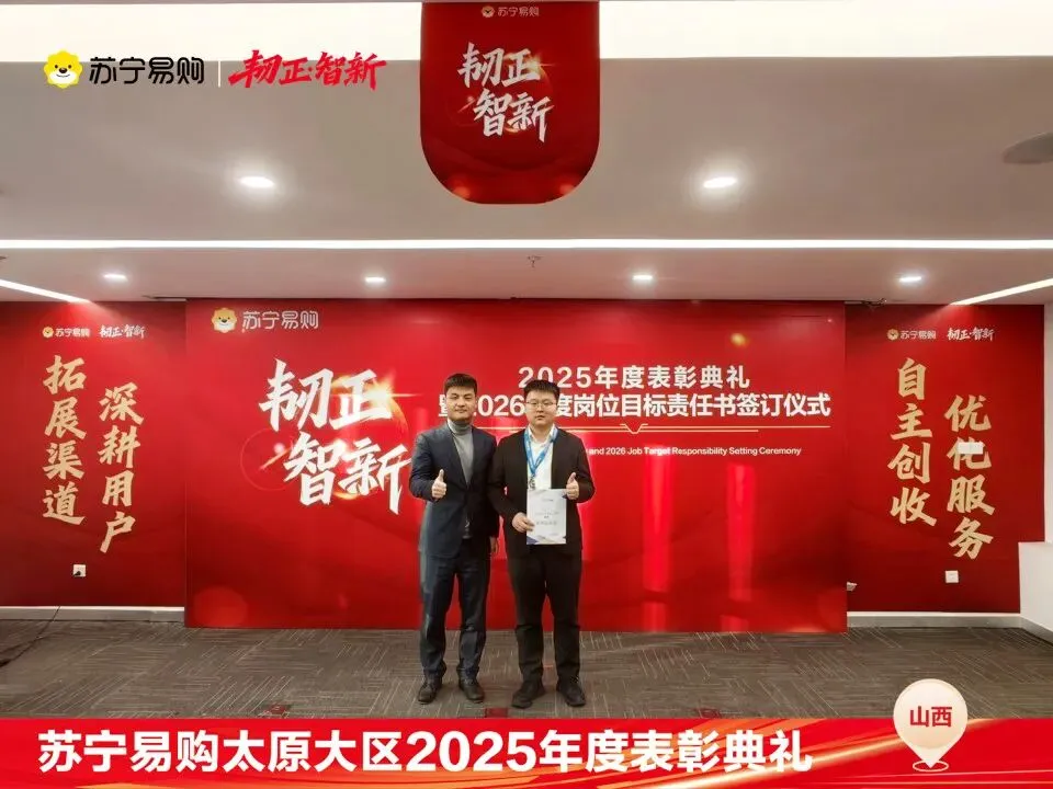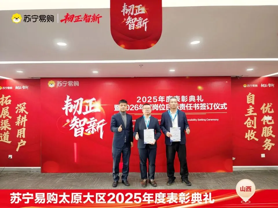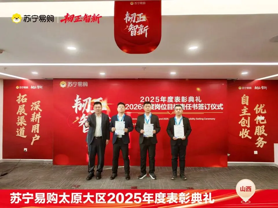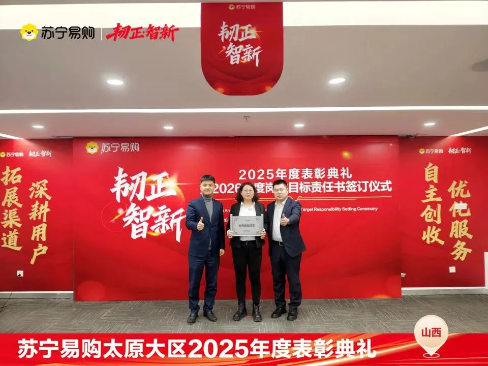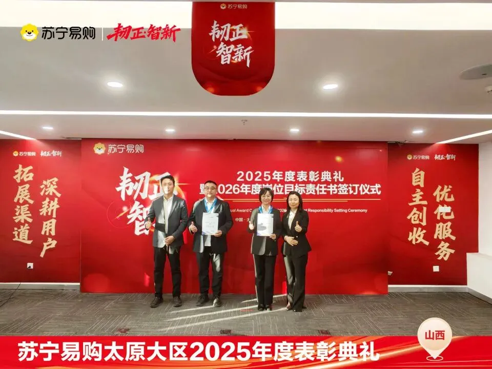 表彰不仅是一种荣誉,对获奖个人与团队在过去一年的业绩、付出的肯定和认可,更是对新的一年业绩、担当上的更高的期望,这也是一份责任和使命。再次向所有获奖人员和团队表示祝贺。同时2026年的战役已打响,让我们一起攻坚克难,再创属于太原大区、属于每一位山西苏宁人的辉煌!
