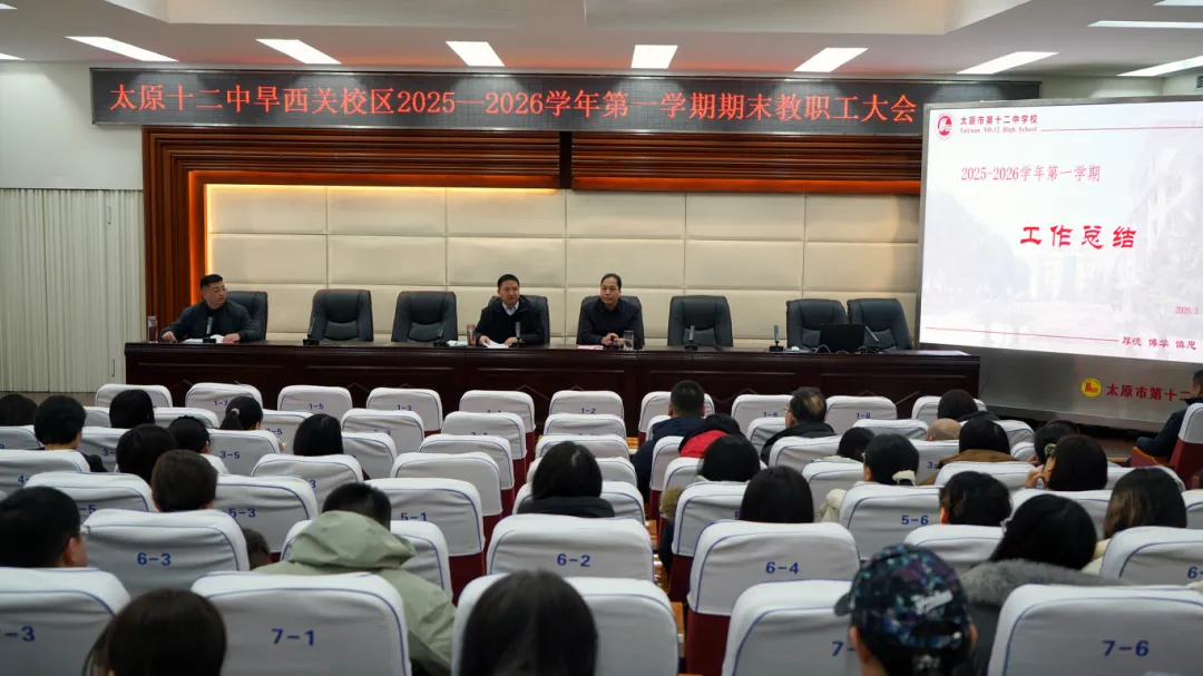 岁聿云暮,新元肇启。2026年2月,太原市第十二中学校隆重召开了2025-2026学年第一学期期末教职工会议暨2026年度寒假安全工作专题会议。会议全面复盘学期耕耘足迹,系统擘画未来发展蓝图,将安全责任意识深植人心,为充满收获的一学期画上圆满句号,更为崭新的征程积蓄蓬勃力量。