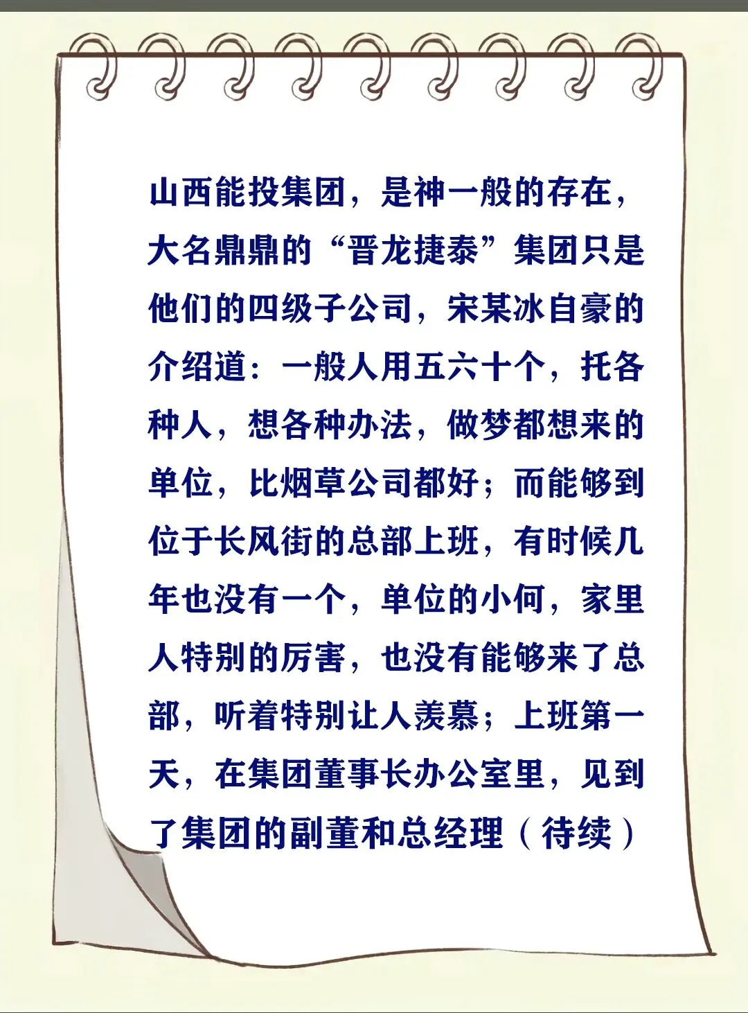 山西能投集团,是神一般的存在,大名鼎鼎的“晋龙捷泰”集团只是他们的四级子公司,宋某冰自豪的介绍道:一般人用五、六十个,托各种人,想各种办法,做梦都想来的单位,比烟草公司都好;而能够到位于长风街的总部上班,有时候几年也没有一个,单位的小何,家里的人特别的厉害,也没有能够来了总部,听着特别让人羡慕;上班第一天,在集团董事长办公室里,见到了集团的副董和总经理(待续)#华远陆港 #山西焦煤