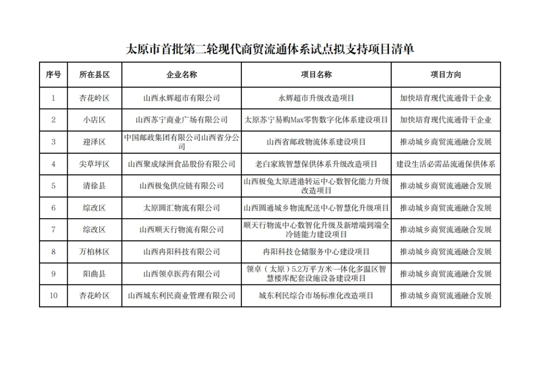 太原市首批第二轮现代商贸流通体系试点拟支持项目清单公示