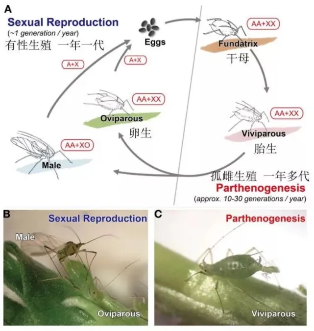 需要说明一下的是,蚜虫的性染色体为特殊的XO型,它们没有Y染色体,性别直接由X染色体数量决定,这是适配其孤雌生殖与有性生殖交替繁殖策略的演化特征。雌性蚜虫均为二倍体,体细胞含成对X染色体(XX),孤雌生殖时通过无减数分裂(类似有丝分裂)产二倍体卵直接发育为雌蚜,有性生殖时经减数分裂产生单倍体X卵;雄性蚜虫体细胞仅含一条X染色体(XO),在产生雄性后代的过程中,雌性蚜虫的卵母细胞进行了一种特殊的减数分裂:常染色体不分离(保持二倍体),而性染色体(XX)发生分离并丢失了一条X染色体。因此,生下来的卵直接发育成了含有XO染色体组的雄性,这些雄性仅在有性生殖世代出现。雄蚜减数分裂产生含X的精子(不携带X的精子会退化),与雌卵结合形成 XX 受精卵越冬,完成染色体循环。