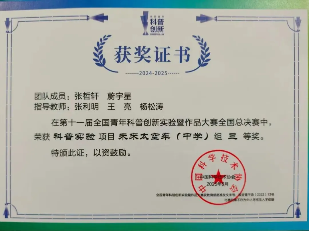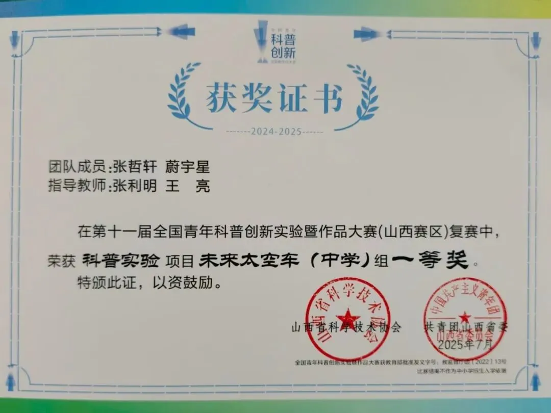 学校科技社团积极投身各类科普创新赛事,屡创佳绩、斩获多项荣誉。在第十一届全国青年科普创新实验暨作品大赛山西赛区竞赛中,我校学子脱颖而出,荣获一等奖;随后在该赛事全国总决赛中,摘得三等奖;在第40届太原市青少年科技创新大赛中,参赛作品荣获一等奖。与此同时,学校还被山西省科学技术协会授予“优秀组织单位”称号。系列赛事的优异表现,彰显了我校学子扎实的实践能力与突出的创新素养,更为学校科学教育的深化推进、创新型人才的培育培养筑牢了坚实的基础。