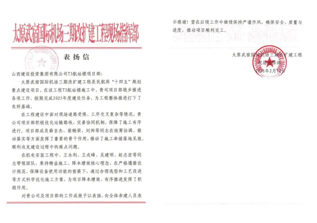 近日,总承包公司第二工程公司太原武宿国际机场三期改扩建工程T3航站楼(东指廊)工程施工项目部收到了来自现场指挥部的表扬信。现场指挥部对项目部在工程建设中展现出的责任担当、务实作风和攻坚能力给予高度评价与充分肯定,对全体参建人员的辛勤付出表示衷心感谢,更对项目部按期圆满完成2025年度建设任务予以通报表扬。