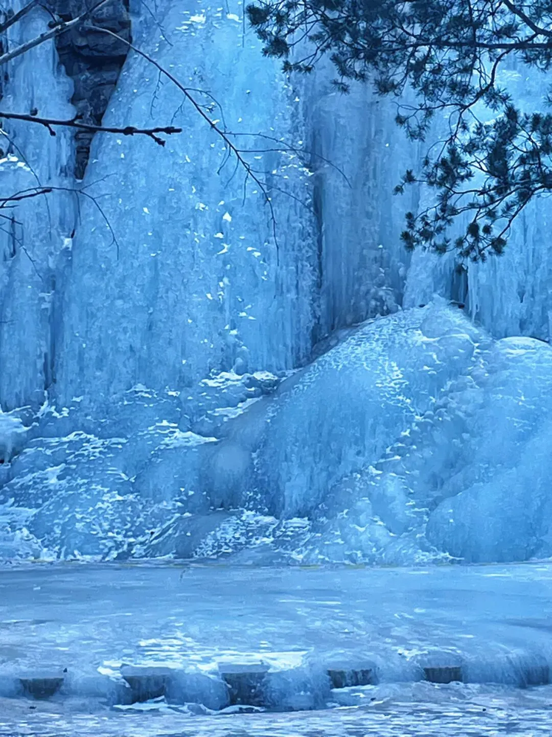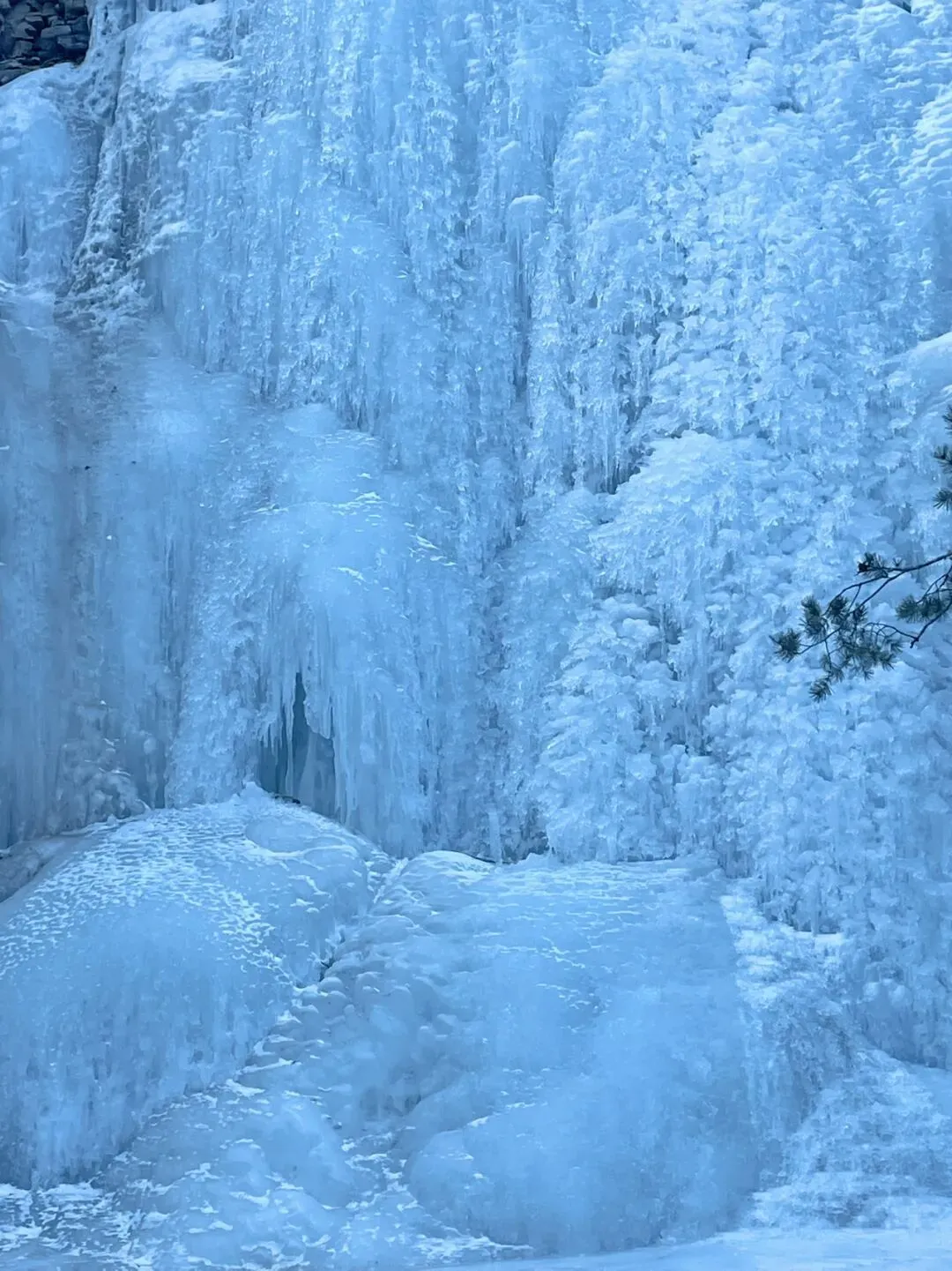 • 冰瀑奇观:几十米高的悬崖上,冰瀑如银河倾泻而下,在阳光的照射下泛着幽蓝的光,每一根冰柱都像精心雕琢的水晶。