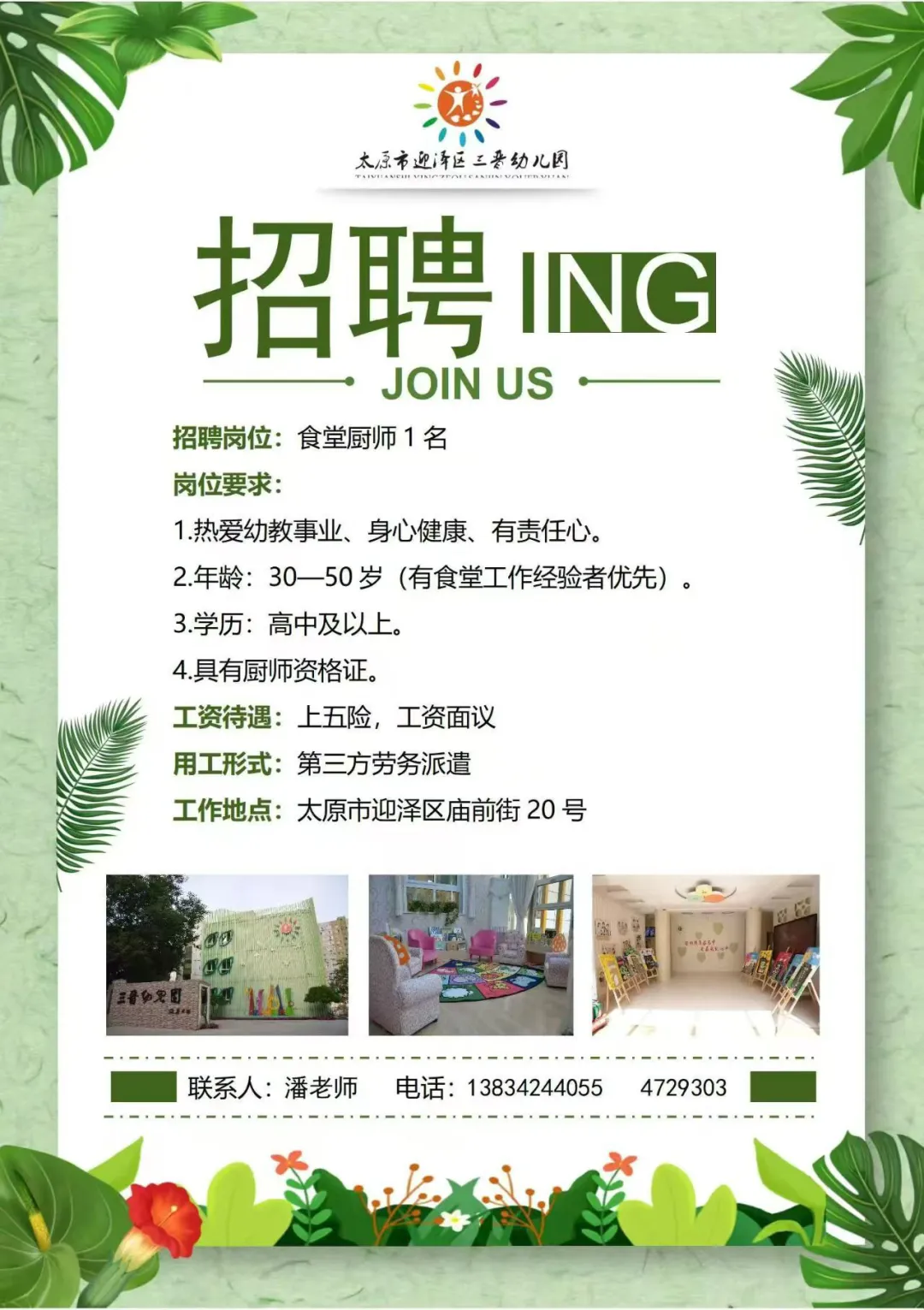 最新招聘||太原市迎泽区三晋幼儿园招聘厨师