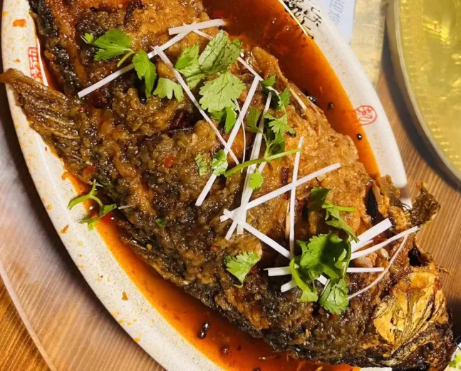 重点说说这黄河大鲤鱼。不是那种精致的摆盘菜,是粗犷的家常烧法。鱼得是活蹦乱跳从河里捞上来的,肉质紧实。先过油炸得两面金黄,再用大铁锅慢炖,葱姜蒜给得足,酱油味儿透进鱼肉肌理。一口下去,外皮吸满了汤汁,鱼肉却鲜嫩得弹牙,那股子土腥味早被醋香化解了,只剩下踏实。