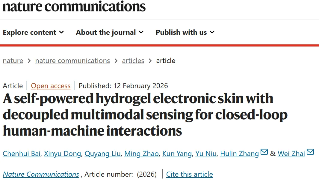 “A self-powered hydrogel electronic skin with decoupled multimodal sensing for closed-loop human-machine interactions”Nature Communications.