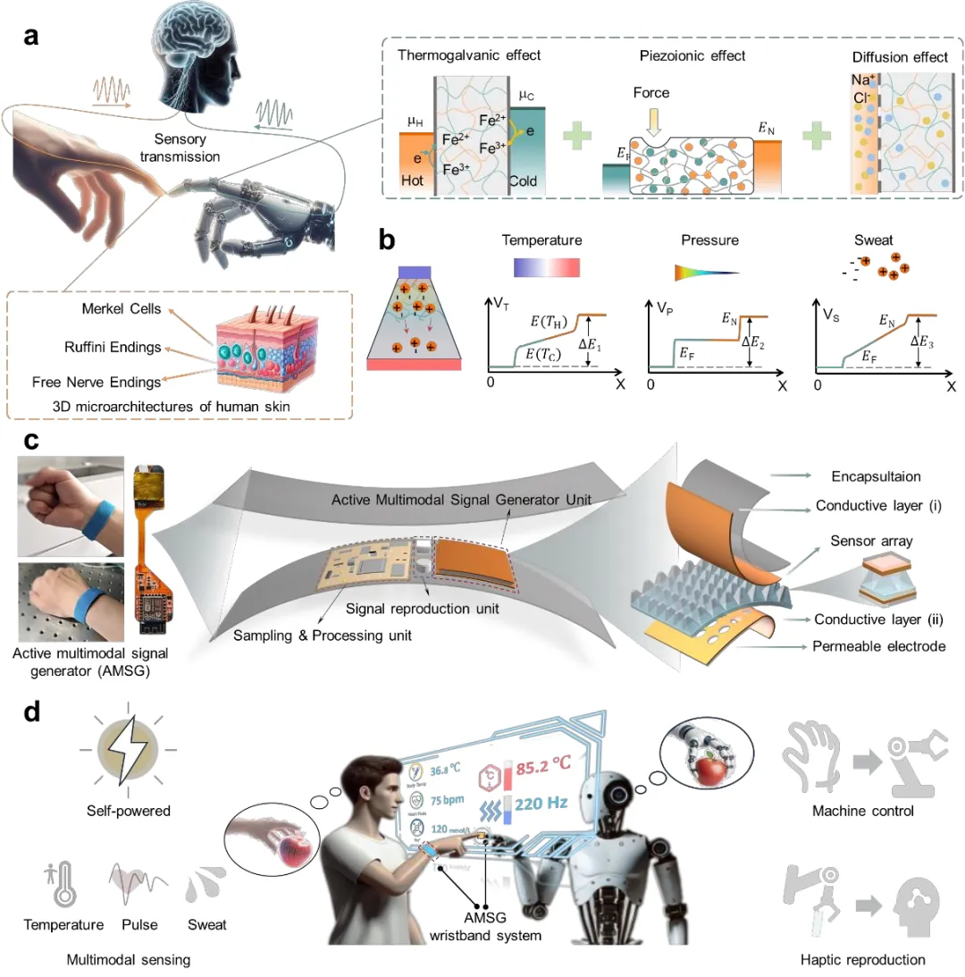 当前,具有类肤感知能力的电子界面在推动人机融合智能方面展现出巨大潜力,但如何在单一材料系统中同时实现自供能、多模态感知与闭环交互仍是重大挑战。为此,本研究提出一种基于单组分聚乙烯醇水凝胶的电子皮肤,通过巧妙整合热电流效应(温度)、压电离子效应(压力)与扩散效应(汗液电解质),在无需外部供能的情况下实现对体温、动脉脉搏与汗液分泌的同时、实时、非侵入式监测。该水凝胶具有高拉伸性(>800%)与低模量(<300 kPa),并通过棱柱结构设计放大离子极化输出。结合基于长短时记忆网络与局部注意力机制的时序解耦模型,成功实现了对复合信号的高精度分离。进一步集成至主动式多模态信号发生器腕带,该界面不仅可用于生理监测,还可实现手势控制机器人与触觉反馈再现等闭环人机交互功能,为智能交互系统提供了高效、集成的材料平台。